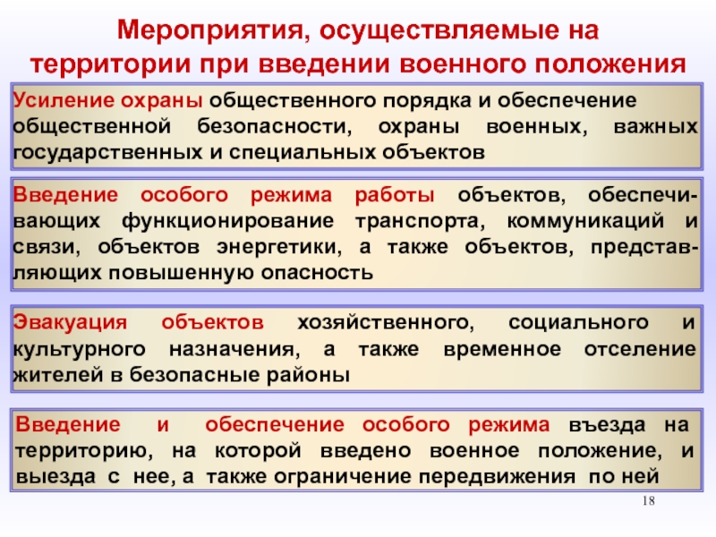 Введение особого режима работы объектов, обеспечи-вающих функционирование транспорта, коммуникаций и связи, объектов энергетики, а также объектов, представ-ляющих повышенную опасность