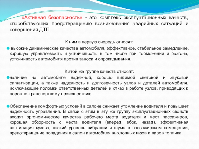Обеспечение комфортных условий в салоне снижает утомление водителя и повышает надежность управления. В связи с этим в эту же группу эксплуатационных свойств входят эргономические качества рабочего места водителя и мест пассажиров, хорошая обзорность с места водителя (вперед, вбок, назад), эффективная вентиляция кузова, низкий уровень вибрации и шума в пассажирском помещении, предотвращение попадания в салон автомобиля выхлопных газов и паров топлива.
