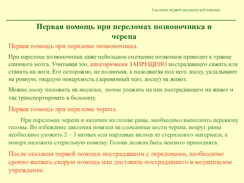 При переломе позвоночника даже небольшое смещение позвонков приводит к травме спинного мозга. Учитывая это, категорически ЗАПРЕЩЕНО пострадавшего сажать или ставить на ноги. Его осторожно, не поднимая, а пододвигая под него доску, укладывают на ровную, твердую поверхность (деревянный щит, доску) на живот.