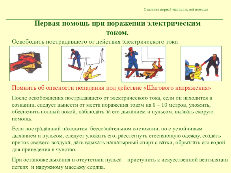 После освобождения пострадавшего от электрического тока, если он находится в сознании, следует вынести от места поражения током на 8 – 10 метров, уложить, обеспечить полный покой, наблюдать за его дыханием и пульсом, вызвать скорую помощь.