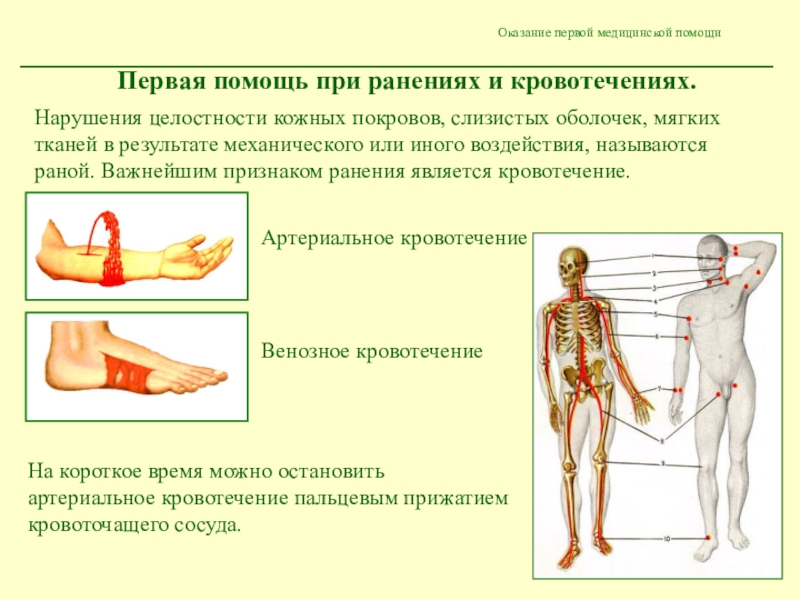 Нарушения целостности кожных покровов, слизистых оболочек, мягких тканей в результате механического или иного воздействия, называются раной. Важнейшим признаком ранения является кровотечение.