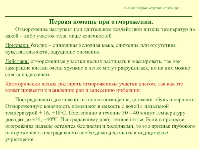 Отморожение наступает при длительном воздействии низких температур на какой – либо участок тела, чаще конечностей