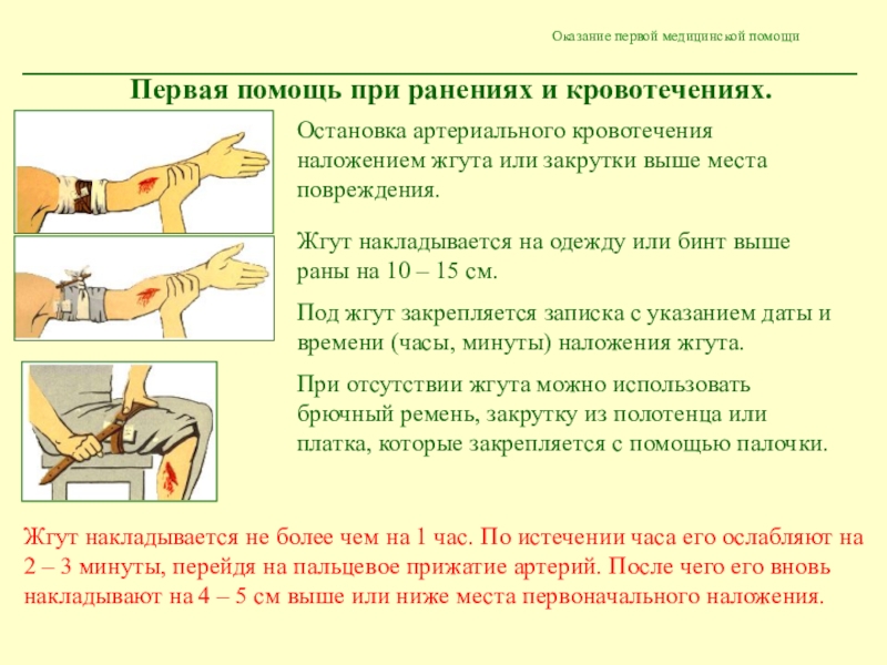 Жгут накладывается на одежду или бинт выше раны на 10 – 15 см.