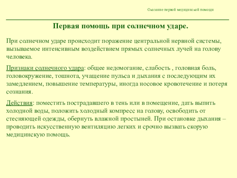 Действия: поместить пострадавшего в тень или в помещение, дать выпить холодной воды, положить холодный компресс на голову, освободить от стесняющей одежды, обернуть влажной простыней. При остановке дыхания – проводить искусственную вентиляцию легких и срочно вызвать скорую медицинскую помощь.