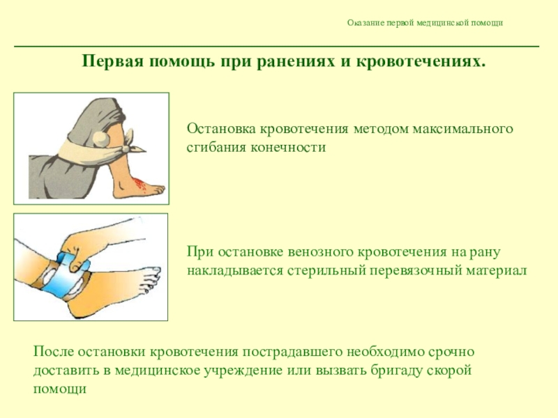 Остановка артериального кровотечения наложением жгута или закрутки выше места повреждения.