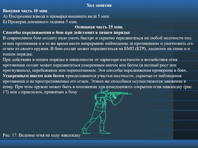 Для пере-ползанияпо-пластунски лечь плотно на землю, правой рукой взять автомат за ремень у верхней антабки и положить его на предплечье правой руки. Подтянуть правую (левую) ногу и одновременно вытянуть левую (правую) руку как можно дальше. Затем, отталкиваясь согнутой ногой, передвинуть тело вперед и подтянуть другую ногу, вытянуть другую руку и продолжать движение в том же порядке. При пере-ползании голову высоко не поднимать.