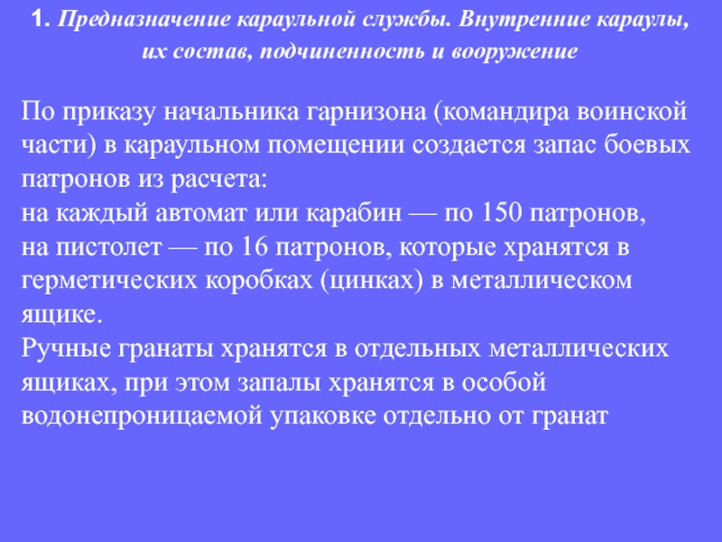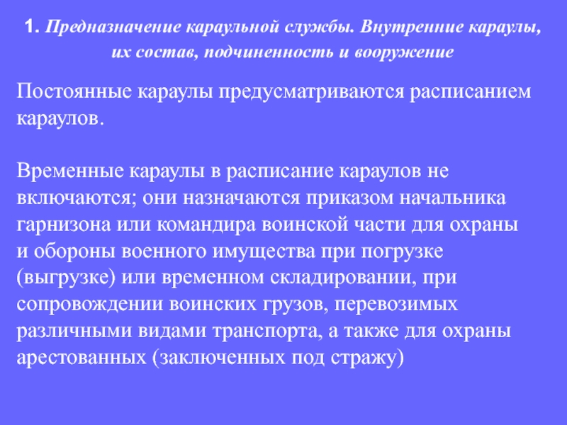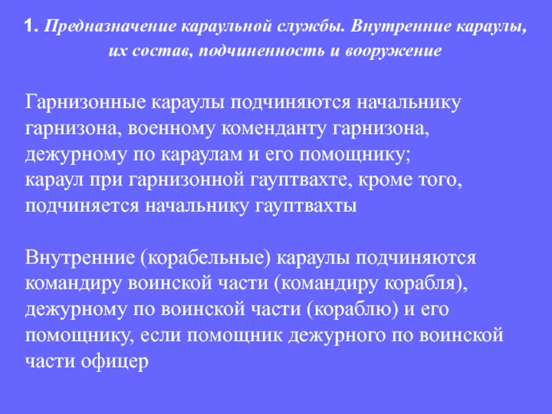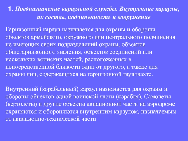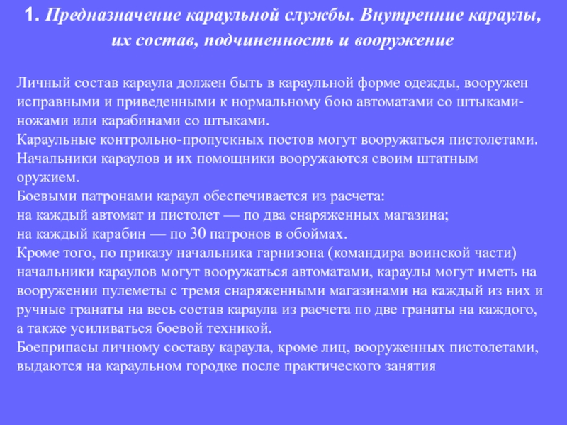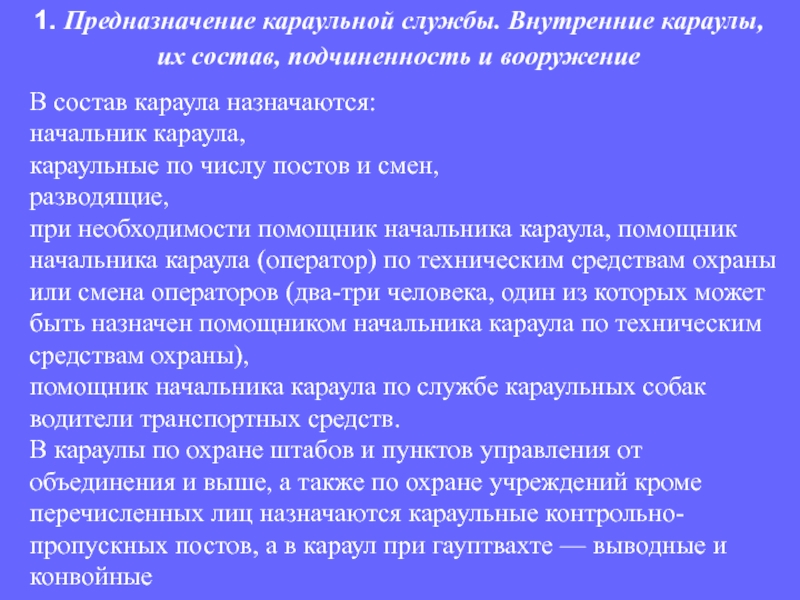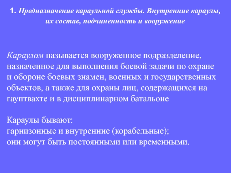 1. Предназначение караульной службы. Внутренние караулы, их состав, подчиненность и вооружение