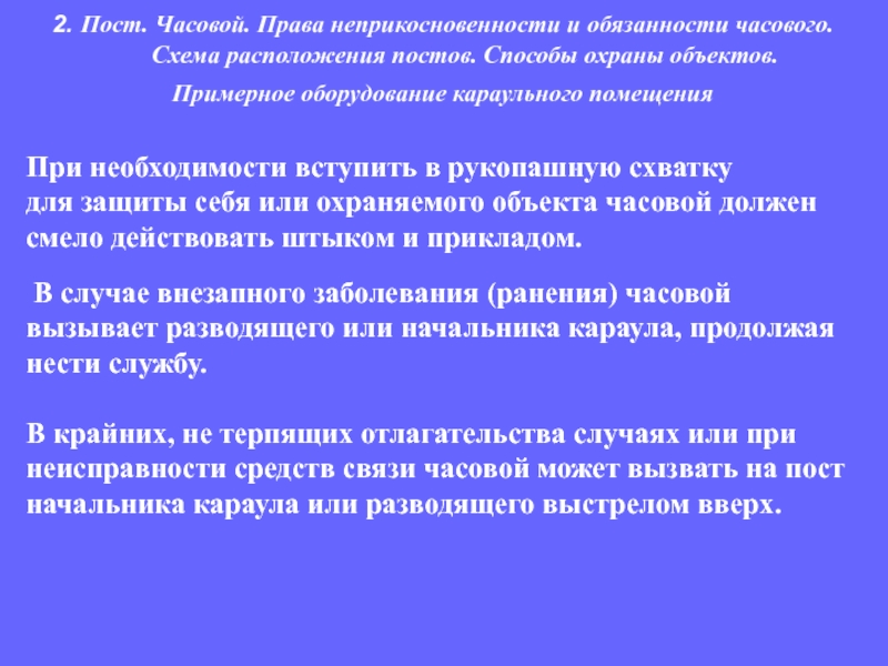 При необходимости вступить в рукопашную схватку для защиты себя или охраняемого объекта часовой должен смело действовать штыком и прикладом.  В случае внезапного