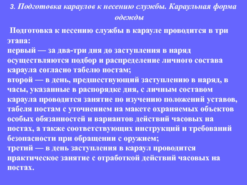 Подготовка к несению службы в карауле проводится в три этапа:первый — за два-три дня до заступления