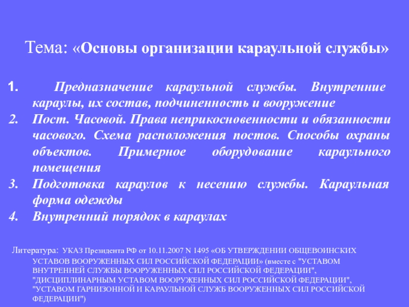 Тема: «Основы организации караульной службы»  Предназначение караульной службы. Внутренние караулы, их состав, подчиненность и вооружение Пост.