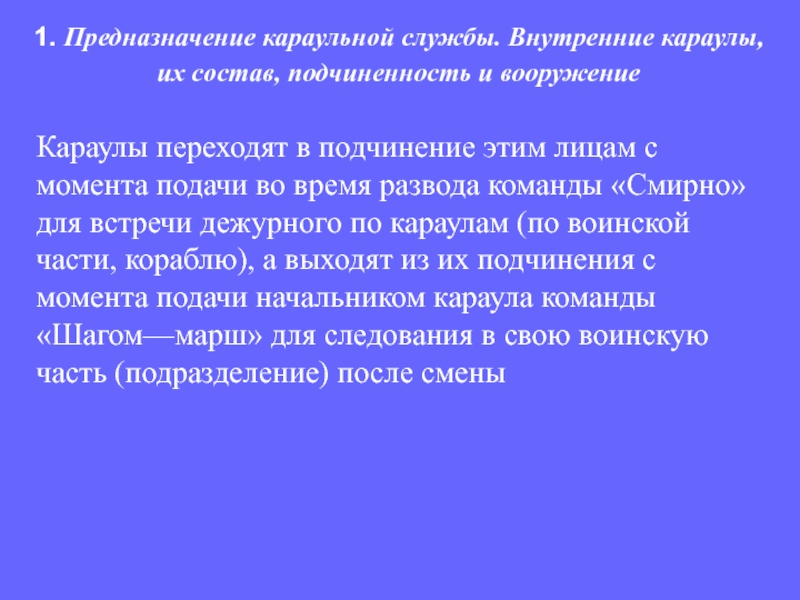 развода команды «Смирно» для встречи дежурного по караулам (по воинской части, кораблю), а выходят из их подчинения с момента подачи начальником караула команды «Шагом—марш» для следования в свою воинскую часть (подразделение) после смены