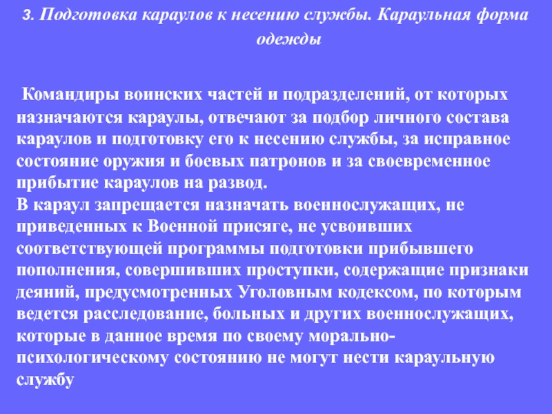 В караул запрещается назначать военнослужащих, не приведенных к Военной присяге, не усвоивших соответствующей программы подготовки прибывшего пополнения, совершивших проступки, содержащие признаки деяний, предусмотренных Уголовным кодексом, по которым ведется расследование, больных и других военнослужащих, которые в данное время по своему морально-психологическому состоянию не могут нести караульную службу