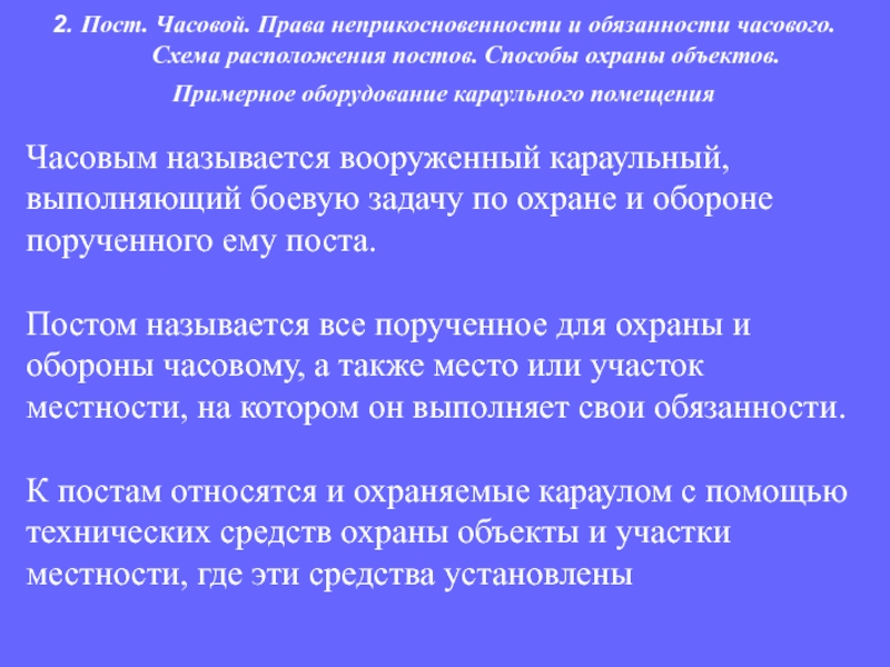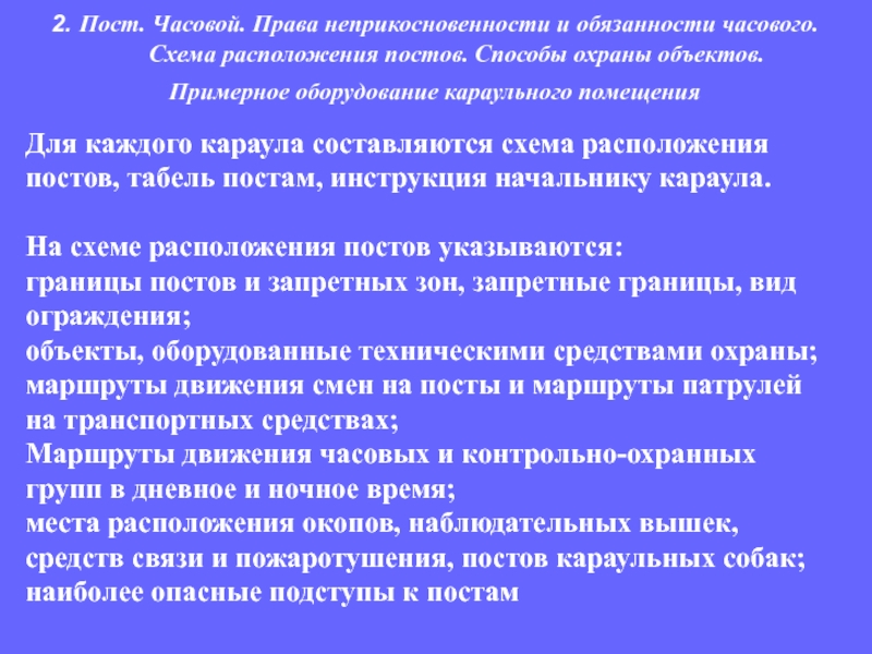 2. Пост. Часовой. Права неприкосновенности и обязанности часового. Схема расположения постов. Способы охраны объектов.