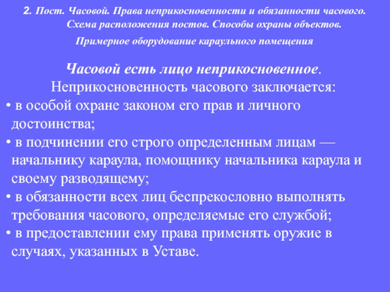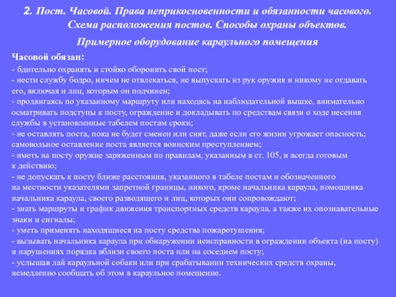 Пост. Часовой. Права неприкосновенности и обязанности часового. Схема расположения постов. Способы охраны объектов. Примерное оборудование караульного помещения