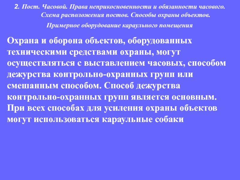 Охрана и оборона объектов, оборудованных техническими средствами охраны, могут осуществляться с выставлением часовых, способом дежурства контрольно-охранных групп