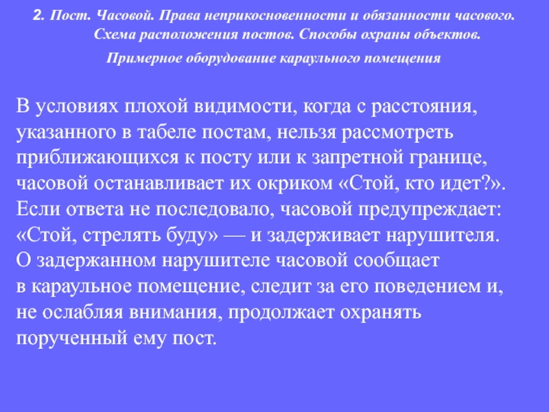 к посту или к запретной границе, часовой останавливает их окриком «Стой, кто идет?». Если ответа не последовало, часовой предупреждает: «Стой, стрелять буду» — и задерживает нарушителя. О задержанном нарушителе часовой сообщает в караульное помещение, следит за его поведением и, не ослабляя внимания, продолжает охранять порученный ему пост.