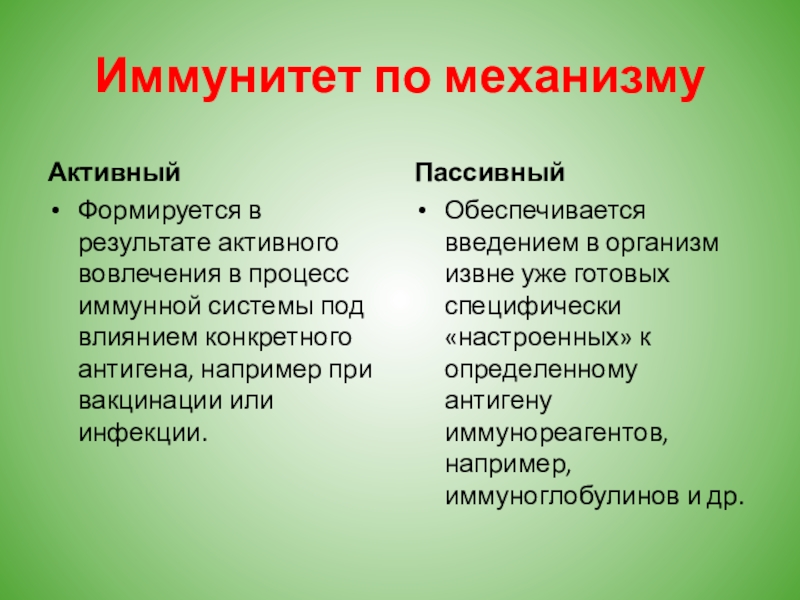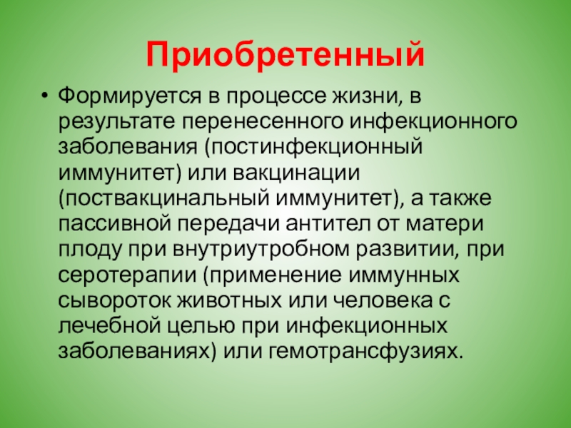 иммунитет) или вакцинации (поствакцинальный иммунитет), а также пассивной передачи антител от матери плоду при внутриутробном развитии, при серотерапии (применение иммунных сывороток животных или человека с лечебной целью при инфекционных заболеваниях) или гемотрансфузиях.