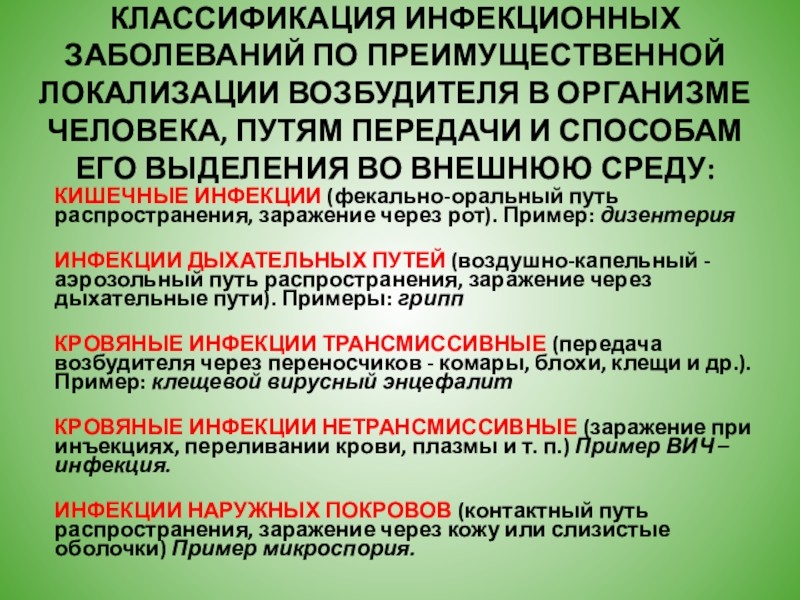 Слайд 7КЛАССИФИКАЦИЯ ИНФЕКЦИОННЫХ ЗАБОЛЕВАНИЙ ПО ПРЕИМУЩЕСТВЕННОЙ ЛОКАЛИЗАЦИИ ВОЗБУДИТЕЛЯ В ОРГАНИЗМЕ ЧЕЛОВЕКА, ПУТЯМ