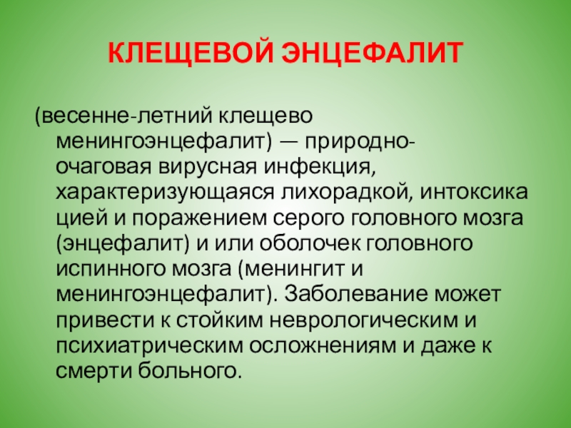 (весенне-летний клещево менингоэнцефалит) — природно-очаговая вирусная инфекция, характеризующаяся лихорадкой, интоксикацией и поражением серого головного мозга(энцефалит) и