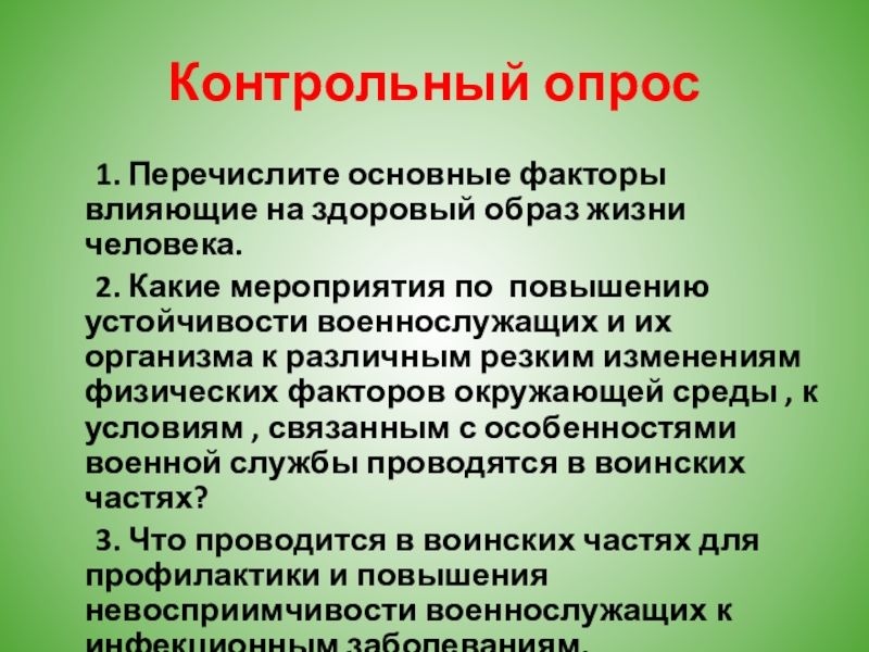 3. Что проводится в воинских частях для профилактики и повышения невосприимчивости военнослужащих к инфекционным заболеваниям.