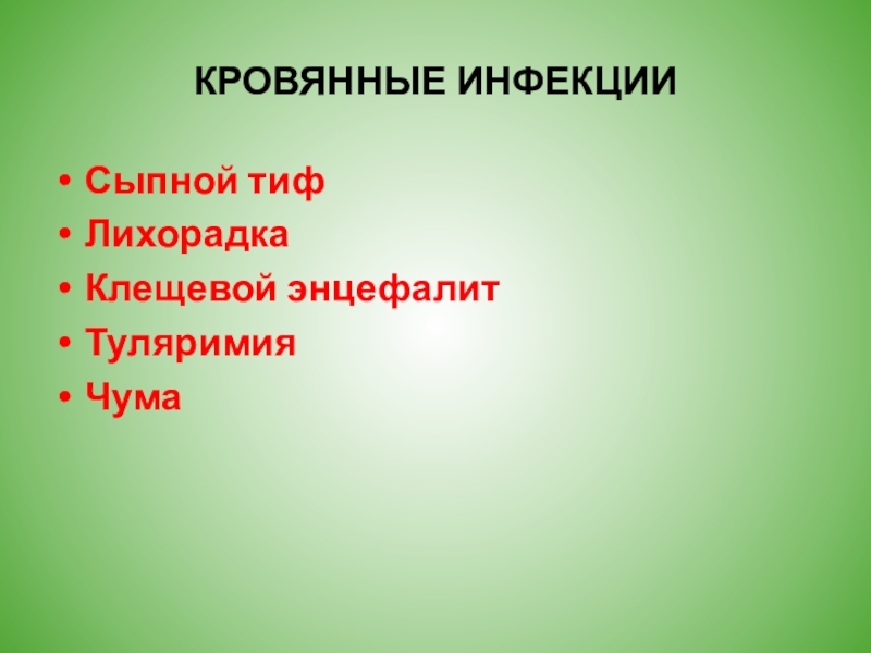 КРОВЯНЫЕ ИНФЕКЦИИ ТРАНСМИССИВНЫЕ (передача возбудителя через переносчиков - комары, блохи, клещи и др.). Пример: клещевой вирусный энцефалит