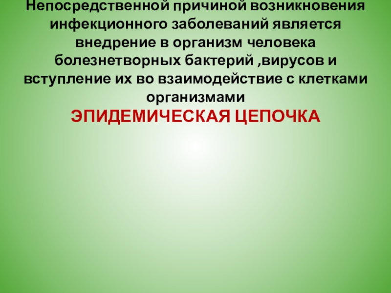 Слайд 6Непосредственной причиной возникновения инфекционного заболеваний является внедрение в организм человека болезнетворных