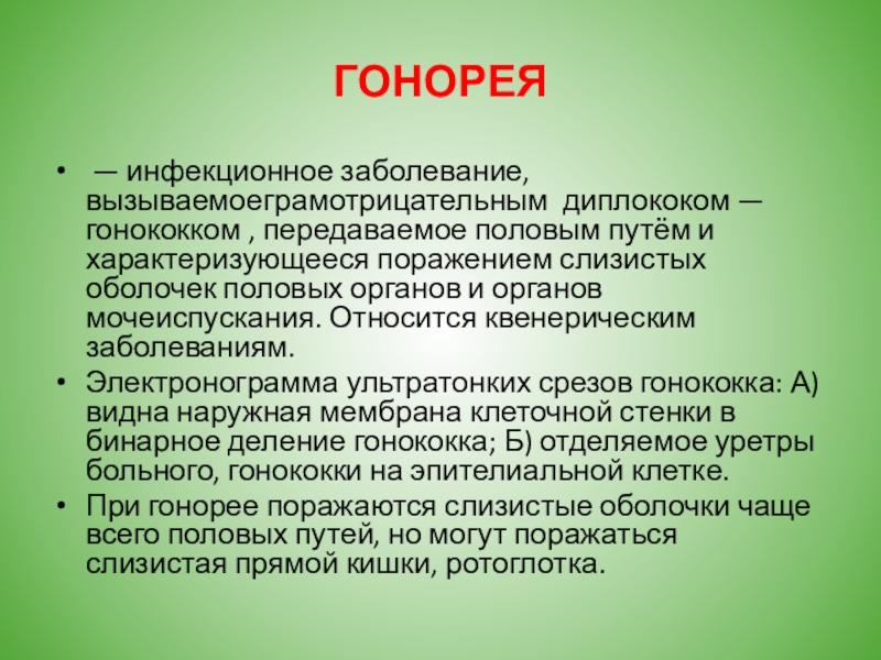 — инфекционное заболевание, вызываемоеграмотрицательным диплококом — гонококком , передаваемое половым путём и характеризующееся