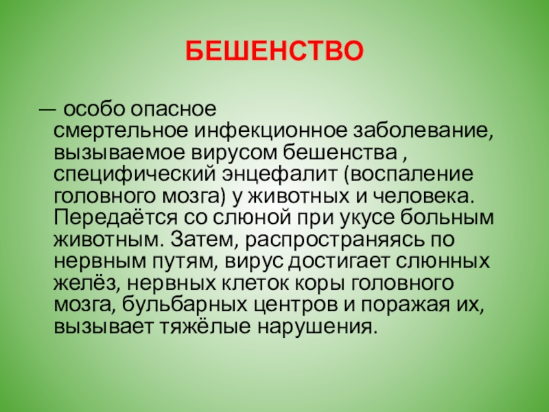 — особо опасное смертельное инфекционное заболевание, вызываемое вирусом бешенства , специфический энцефалит (воспаление головного мозга) у животных