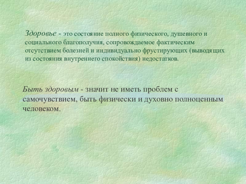 Быть здоровым - значит не иметь проблем с самочувствием, быть физически и духовно полноценным человеком.