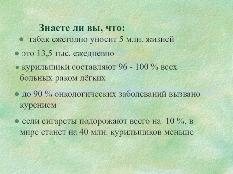 курильщики составляют 96 - 100 % всех больных раком лёгких