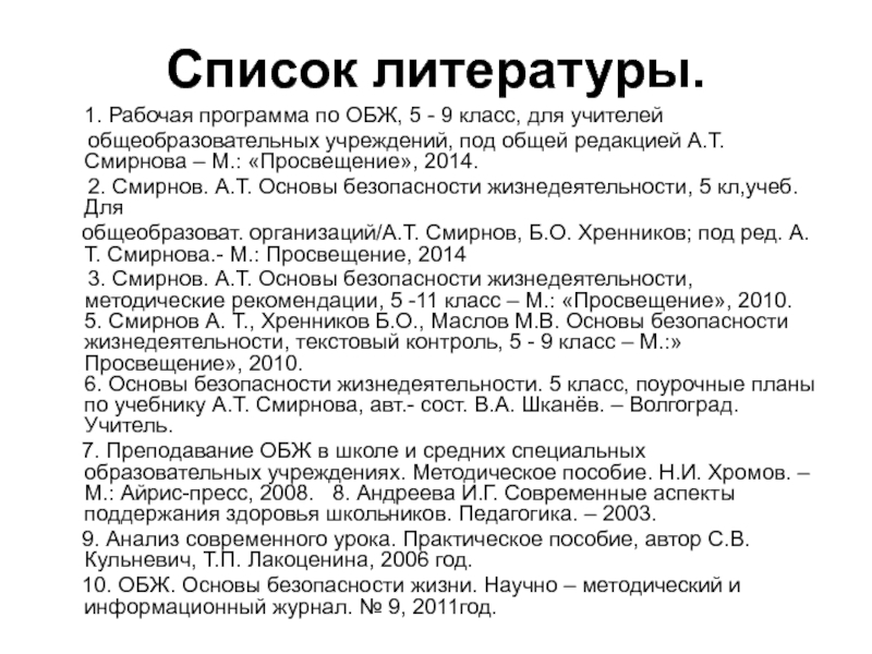 3. Смирнов. А.Т. Основы безопасности жизнедеятельности, методические рекомендации, 5 -11 класс – М.: «Просвещение», 2010. 5. Смирнов А. Т., Хренников Б.О., Маслов М.В. Основы безопасности жизнедеятельности, текстовый контроль, 5 - 9 класс – М.:» Просвещение», 2010. 6. Основы безопасности жизнедеятельности. 5 класс, поурочные планы по учебнику А.Т. Смирнова, авт.- сост. В.А. Шканёв. – Волгоград. Учитель.
