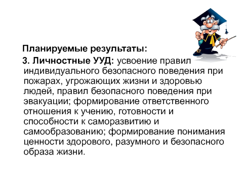 безопасного поведения при пожарах, угрожающих жизни и здоровью людей, правил безопасного поведения при эвакуации; формирование ответственного отношения к учению, готовности и способности к саморазвитию и самообразованию; формирование понимания ценности здорового, разумного и безопасного образа жизни.