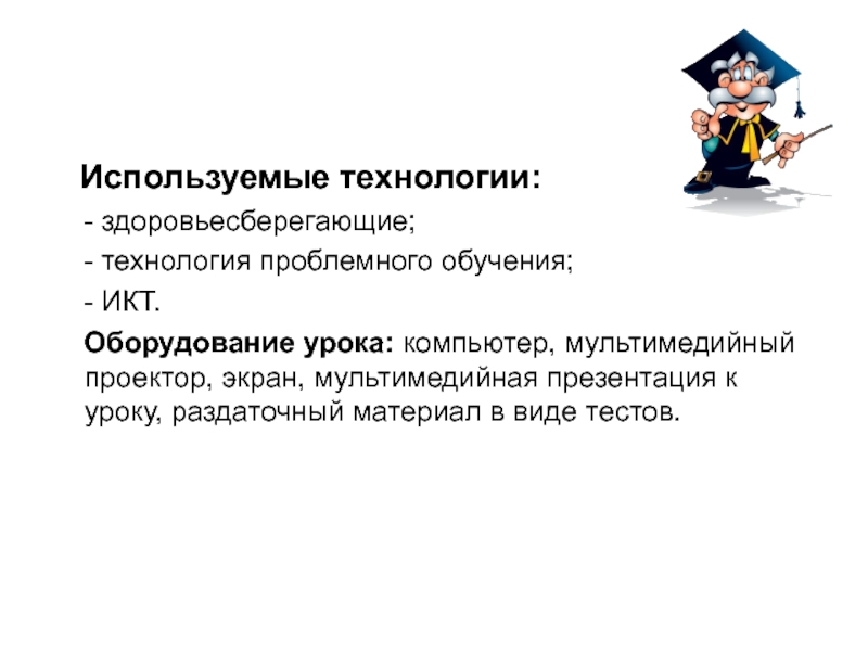 Оборудование урока: компьютер, мультимедийный проектор, экран, мультимедийная презентация к уроку, раздаточный материал в виде тестов.