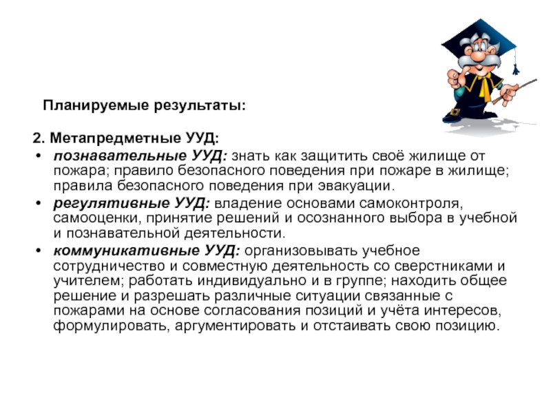 коммуникативные УУД: организовывать учебное сотрудничество и совместную деятельность со сверстниками и учителем; работать индивидуально и в группе; находить общее решение и разрешать различные ситуации связанные с пожарами на основе согласования позиций и учёта интересов, формулировать, аргументировать и отстаивать свою позицию.