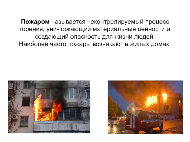 Пожаром называется неконтролируемый процесс горения, уничтожающий материальные ценности и создающий опасность