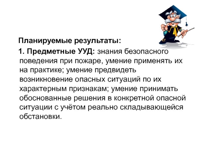 при пожаре, умение применять их на практике; умение предвидеть возникновение опасных ситуаций по их характерным признакам; умение принимать обоснованные решения в конкретной опасной ситуации с учётом реально складывающейся обстановки.