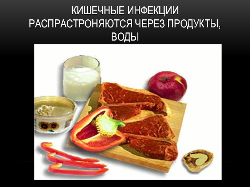 Слайд 15Кишечные инфекции распрастроняются через продукты, воды