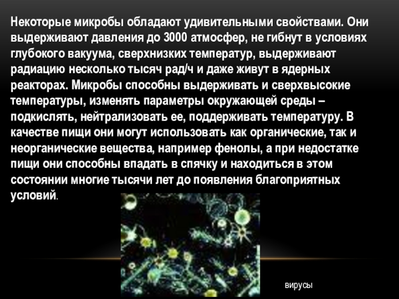 Слайд 7Некоторые микробы обладают удивительными свойствами. Они выдерживают давления до 3000 атмосфер,