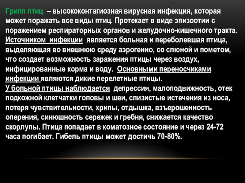 Слайд 29Грипп птиц – высококонтагиозная вирусная инфекция, которая может поражать все виды птиц.