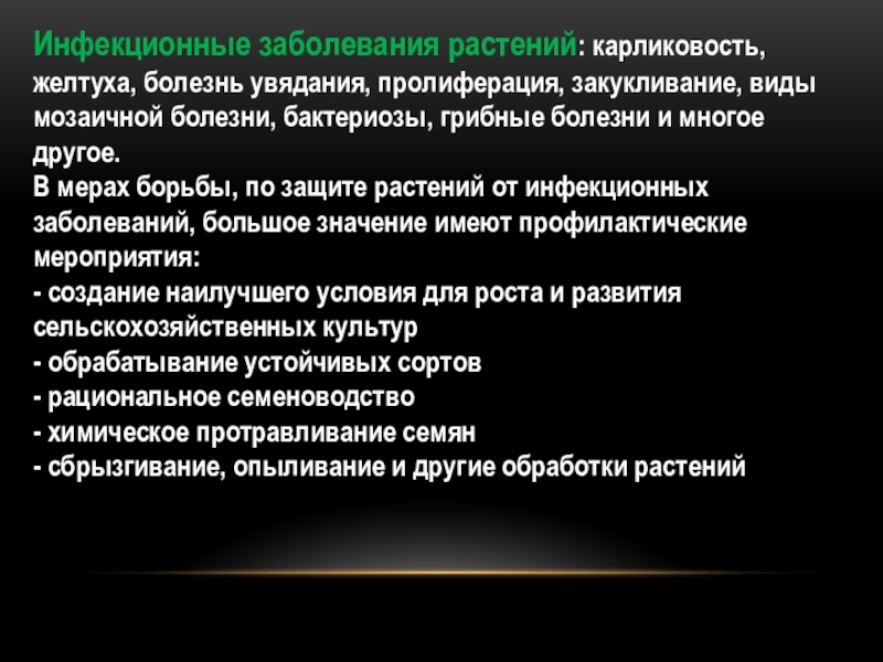 Слайд 38Инфекционные заболевания растений: карликовость, желтуха, болезнь увядания, пролиферация, закукливание, виды мозаичной