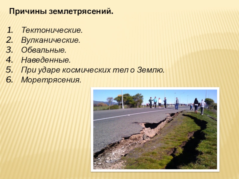 Причины землетрясений.Тектонические.Вулканические.Обвальные.Наведенные.При ударе космических тел о Землю.Моретрясения.