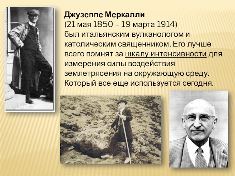 Джузеппе Меркалли (21 мая 1850 – 19 марта 1914) был итальянским вулканологом и католическим священником. Его лучше всего помнят за шкалу интенсивности для измерения