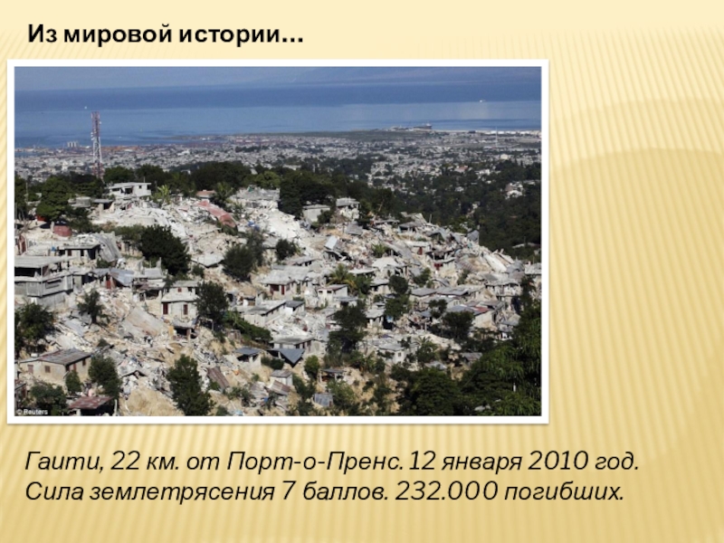 Из мировой истории…Гаити, 22 км. от Порт-о-Пренс. 12 января 2010 год.Сила землетрясения 7 баллов. 232.000 погибших.
