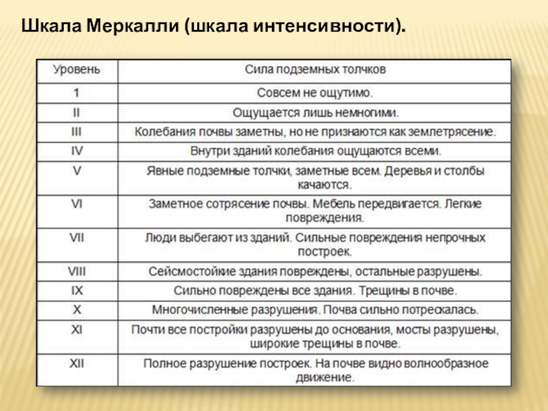 Слайд 13Шкала Меркалли (шкала интенсивности).