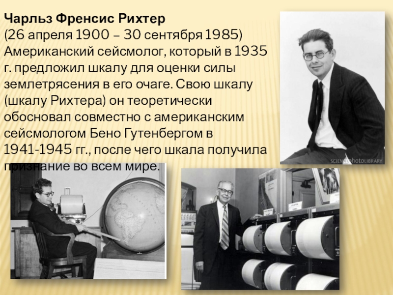 Чарльз Френсис Рихтер(26 апреля 1900 – 30 сентября 1985)Американский сейсмолог, который в 1935 г. предложил шкалу для