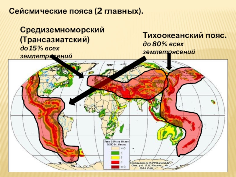 Сейсмические пояса (2 главных).Тихоокеанский пояс.до 80% всех землетрясенийСредиземноморский (Трансазиатский)до 15% всех землетрясений