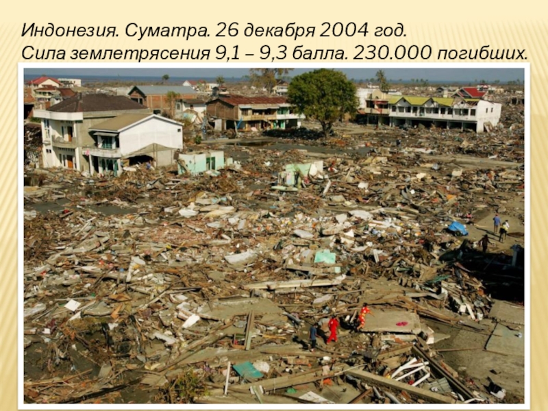 Индонезия. Суматра. 26 декабря 2004 год.Сила землетрясения 9,1 – 9,3 балла. 230.000 погибших.