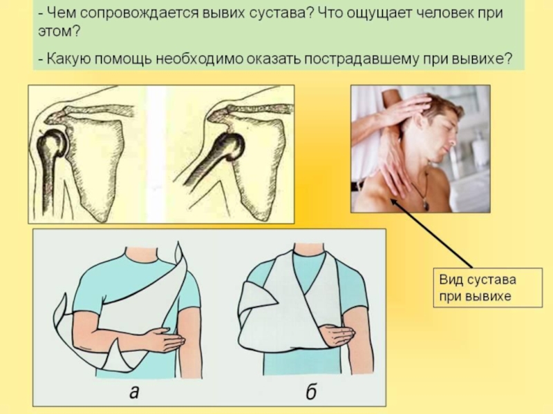 Основные признаки вывихов в суставах конечностей: боль в суставе, нарушение движений в нём, изменение формы сустава.
