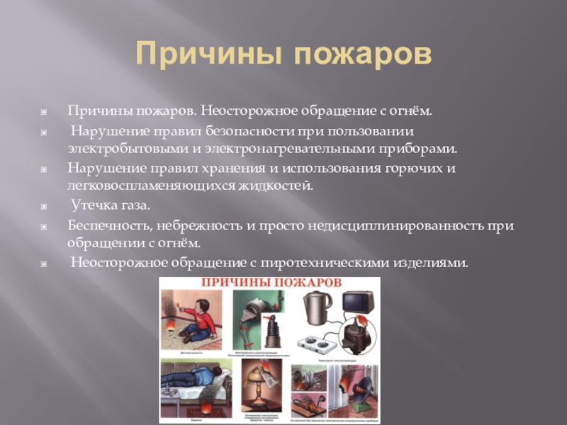 Причины пожаровПричины пожаров. Неосторожное обращение с огнём. Нарушение правил безопасности при пользовании электробытовыми и электронагревательными приборами. Нарушение