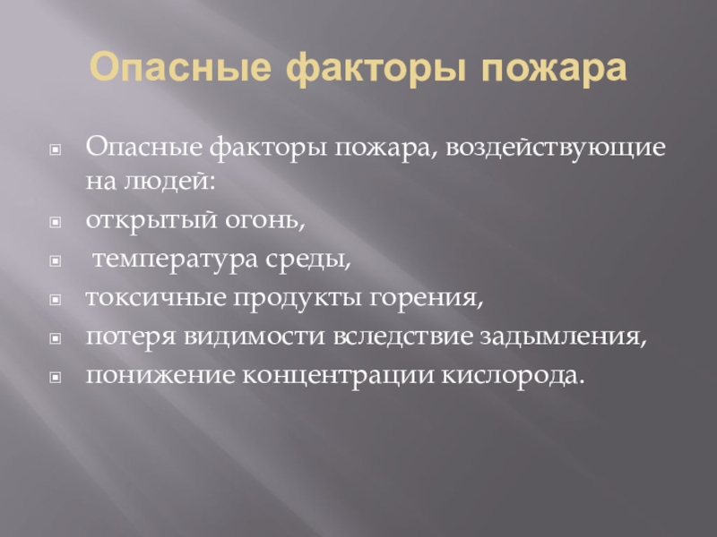 Опасные факторы пожараОпасные факторы пожара, воздействующие на людей: открытый огонь, температура среды, токсичные продукты горения, потеря видимости
